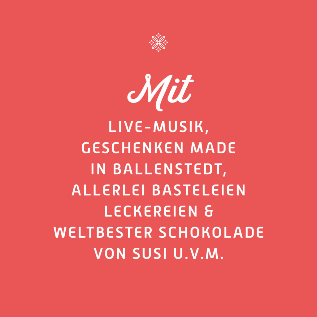 Am Samstag, 29.11.2025 und am 20.12.2025 ab 15 Uhr laden wir Euch herzlich ein zu gemütlichen Stunden im Kuhstall und am Lagerfeuer – mit Punsch, Susis weltbester selbstgemachter Schokolade, Live-Musik und Geschenken Made in Ballenstedt. Unsere Werkstätten stehen für kreative Basteleien offen, und für das leibliche Wohl ist gesorgt. Kommt vorbei, wir freuen uns auf Euch!